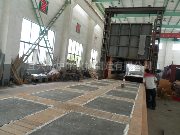 臺車上鋪設(shè)高強度耐高溫的鑄鋼爐底板,以承載工件之用。為了防止工件加熱后產(chǎn)生的氧化皮通過爐底板間的縫隙落入加熱元件周圍而造成加熱元件損壞,爐底板與爐體接觸處采用插入式接觸。為保證正常使用,需要經(jīng)常吹掃臺車爐底板下方的氧化皮,一般每周吹掃一次,吹掃時將爐底板吊起,用壓縮空氣將電阻絲槽內(nèi)的氧化皮屑吹掃干凈,注意防止氧化皮卡在爐絲內(nèi)引起短路。